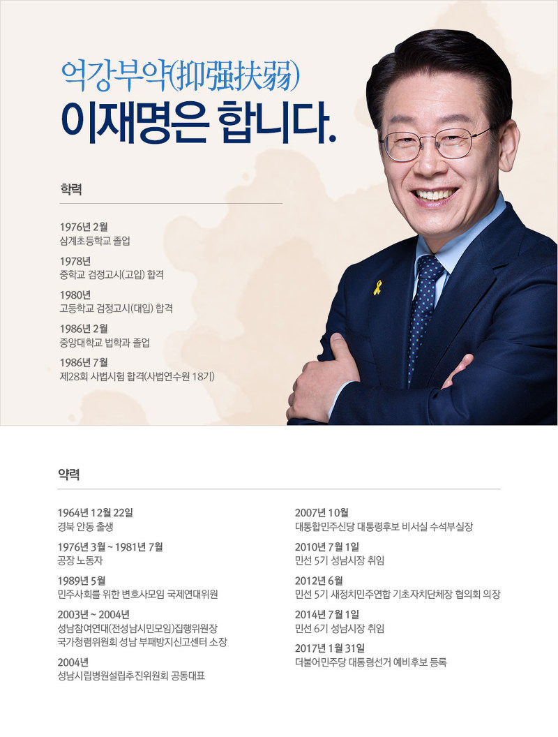 이재명 李在明 Lee Jae-myung 출생일. 중고등학교 과정은 검정고시로 통과했습니다. 이재명 학력 약력.